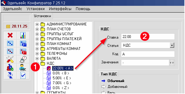 1. Cмена НДС с 2026-го года. И, если в Конфигураторе в 2026-м ставка налога НДС (А) ещё не была изменена с 20 - на 22% автоматически, сделайте это.